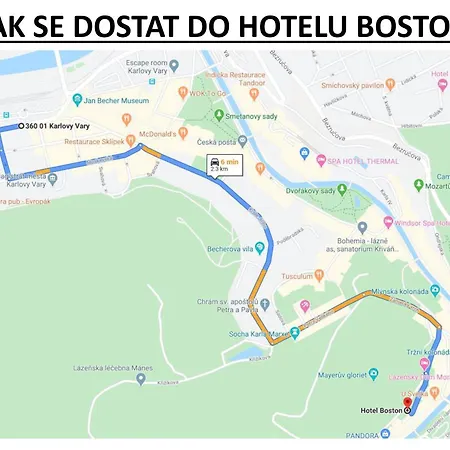 Located a mere 1.3 km from the Russian Orthodox church "Saint Peter and Paul Cathedral", the 3-star Hotel Boston Karlovy Vary is approximately a 5-minute walk from the Deer Leap Lookout. Just around the corner from Sprudelkolonnade, the hotel with 17 rooms features a lift and a vending machine.